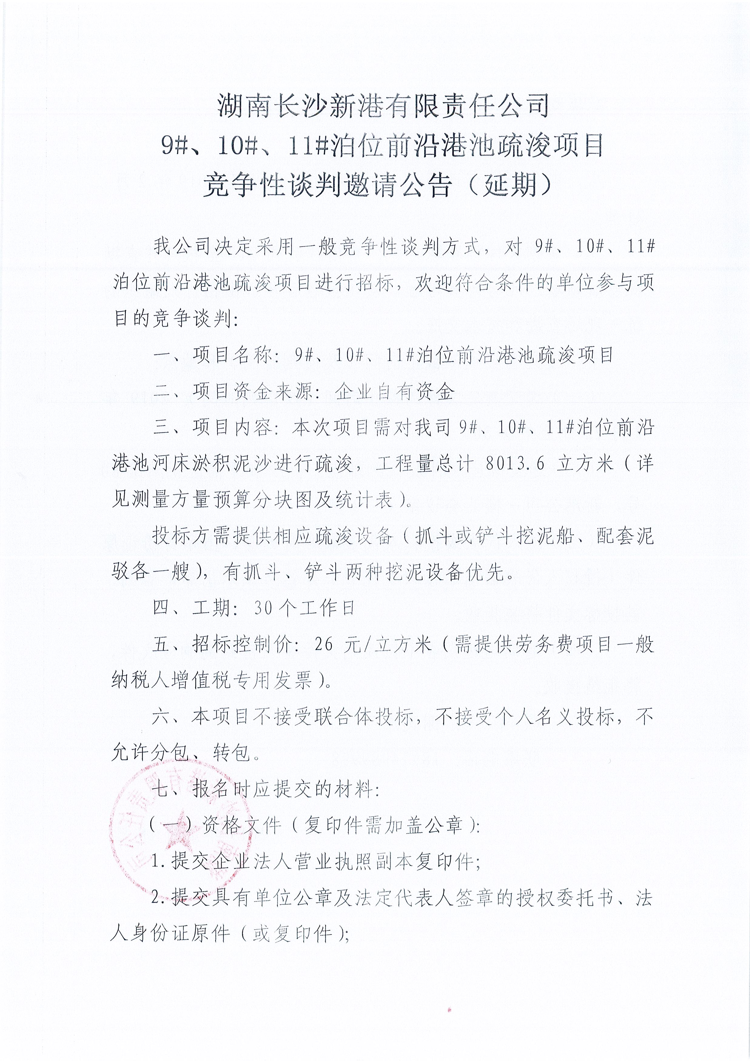 湖南長沙新港有限責任公司 9#、10#、11#泊位前沿港池疏浚項目競爭性談判邀請公告(延期)