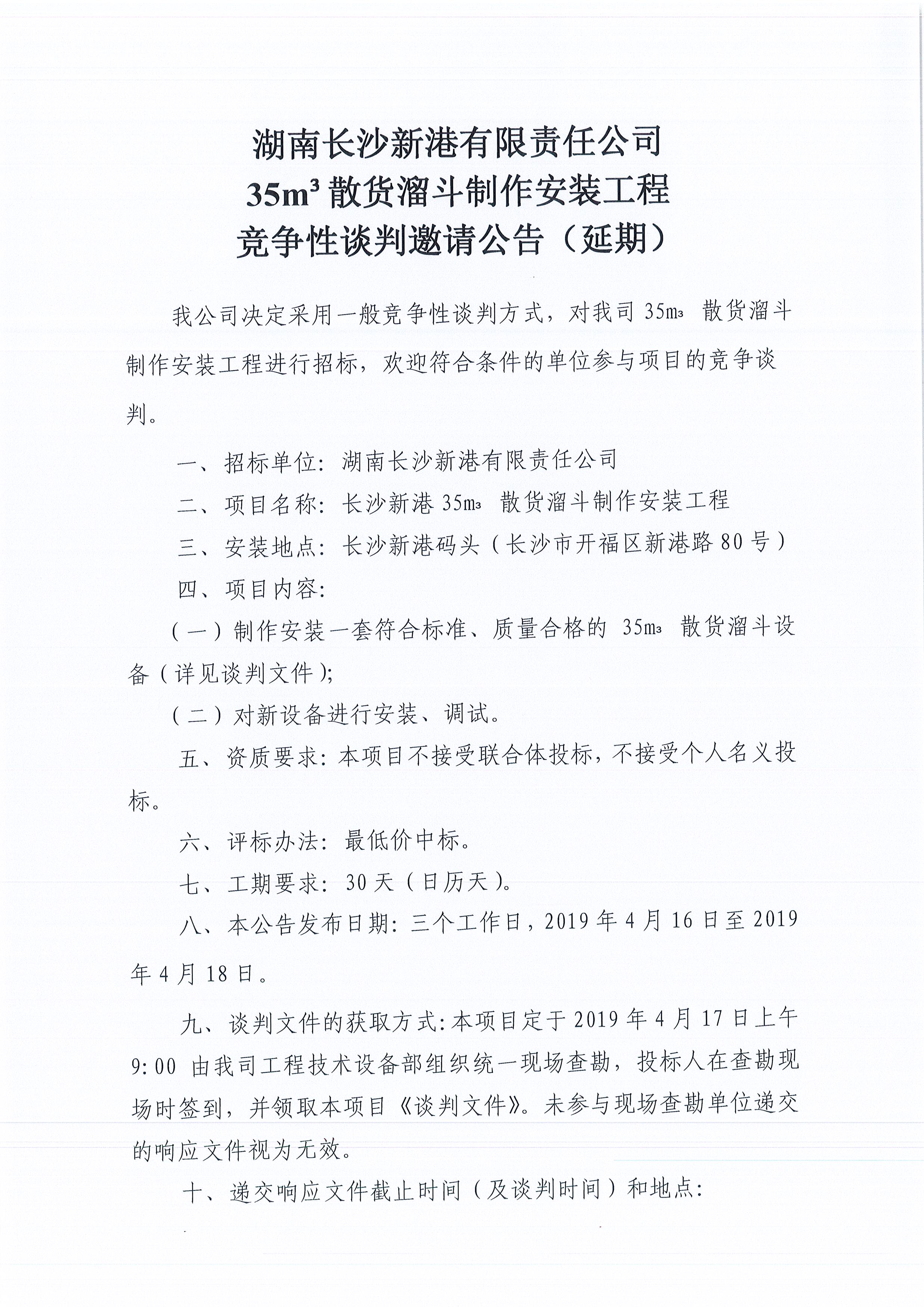 湖南長沙新港有限責(zé)任公司35m³散貨溜斗制作安裝工程競爭性談判邀請公告(延期))