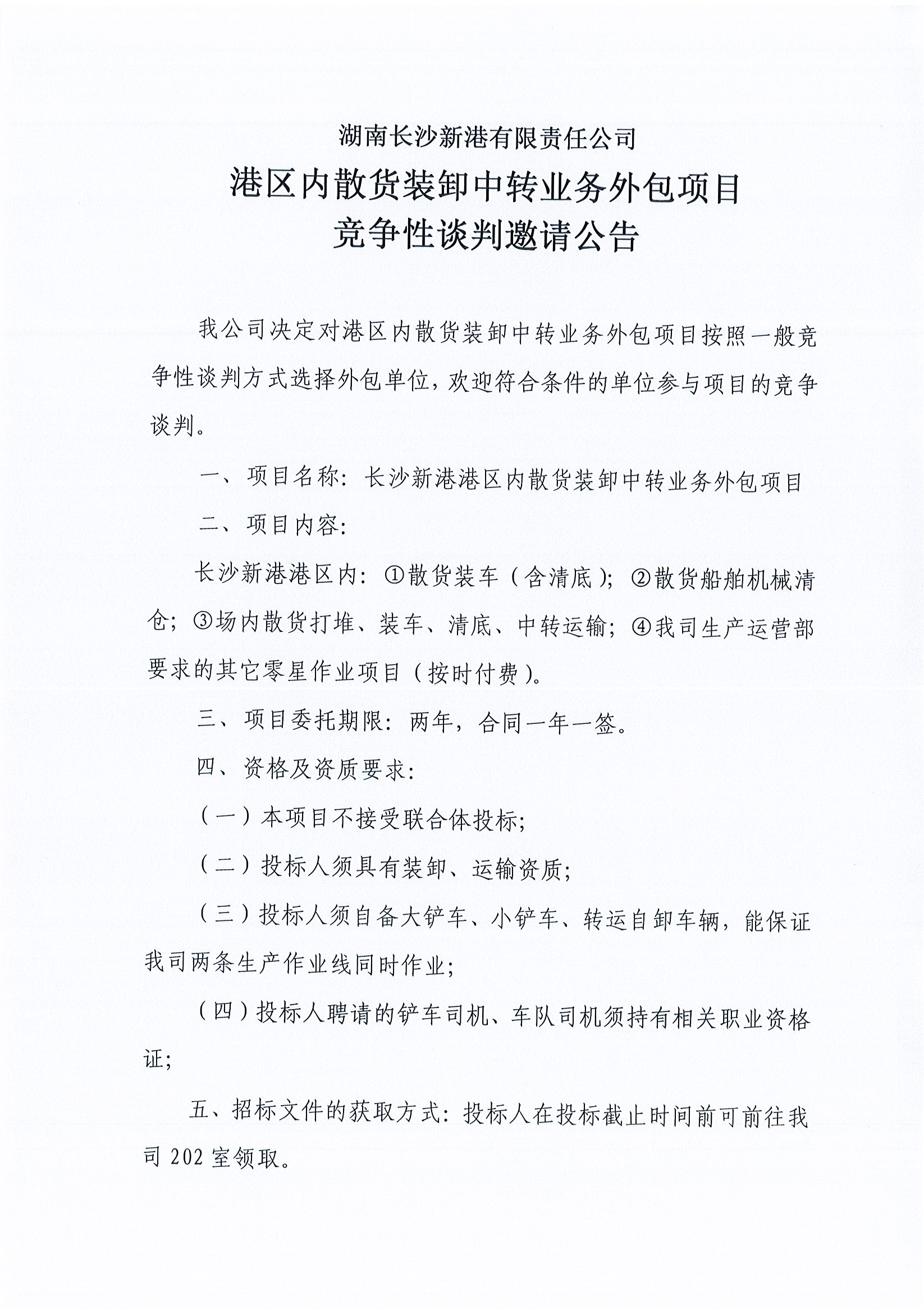 湖南長(zhǎng)沙新港有限責(zé)任公司港區(qū)內(nèi)散貨裝卸中轉(zhuǎn)業(yè)務(wù)外包項(xiàng)目競(jìng)爭(zhēng)性談判邀請(qǐng)公告