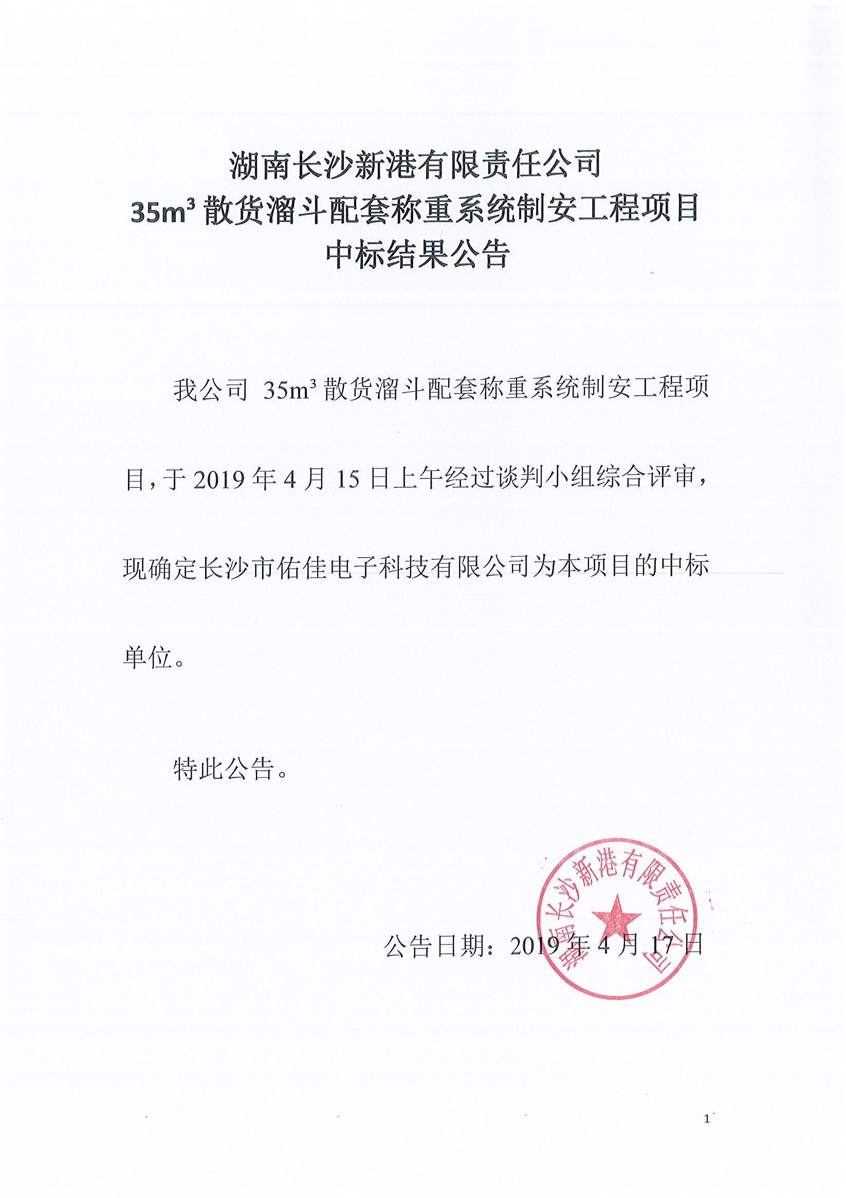 湖南長沙新港有限責任公司35m³散貨溜斗配套稱重系統(tǒng)制安工程項目中標結果公告