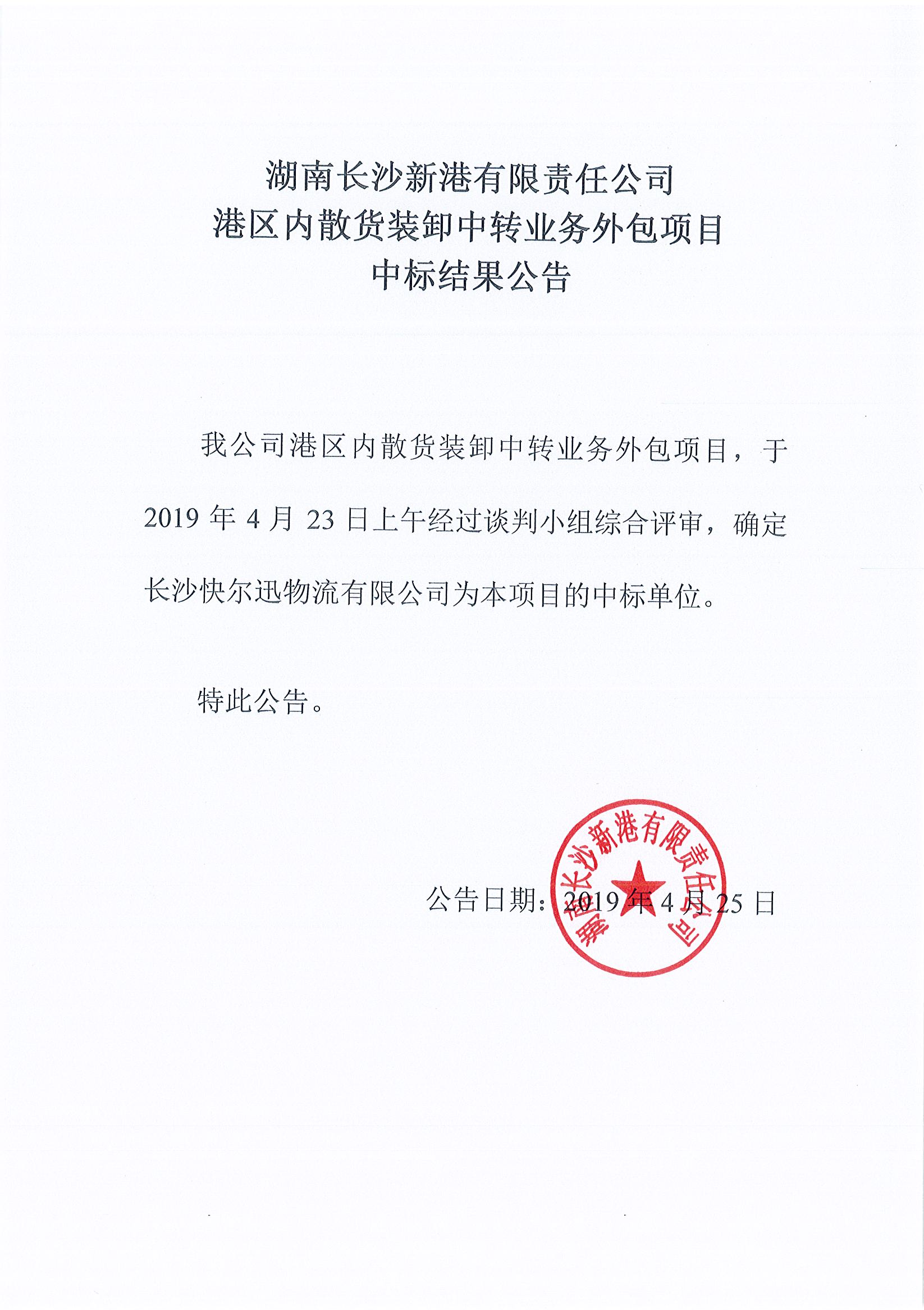 湖南長沙新港有限責(zé)任公司港區(qū)內(nèi)散貨裝卸中轉(zhuǎn)業(yè)務(wù)外包項目中標(biāo)結(jié)果公告