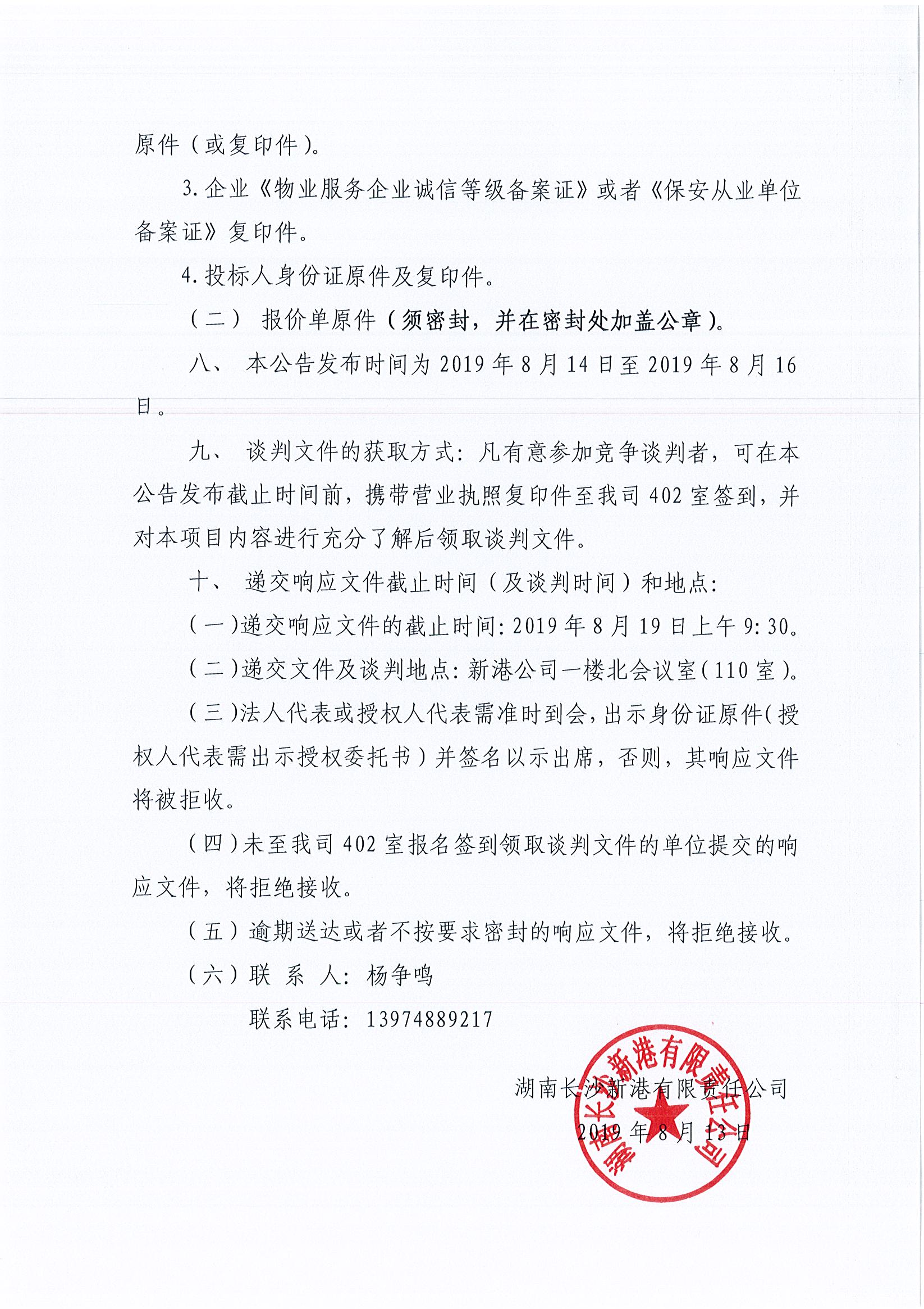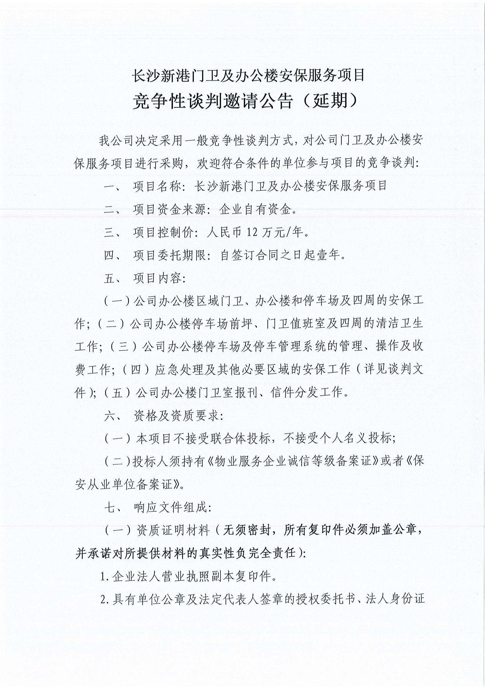 長(zhǎng)沙新港門(mén)衛(wèi)及辦公樓安保服務(wù)項(xiàng)目競(jìng)爭(zhēng)性談判邀請(qǐng)公告(延期)