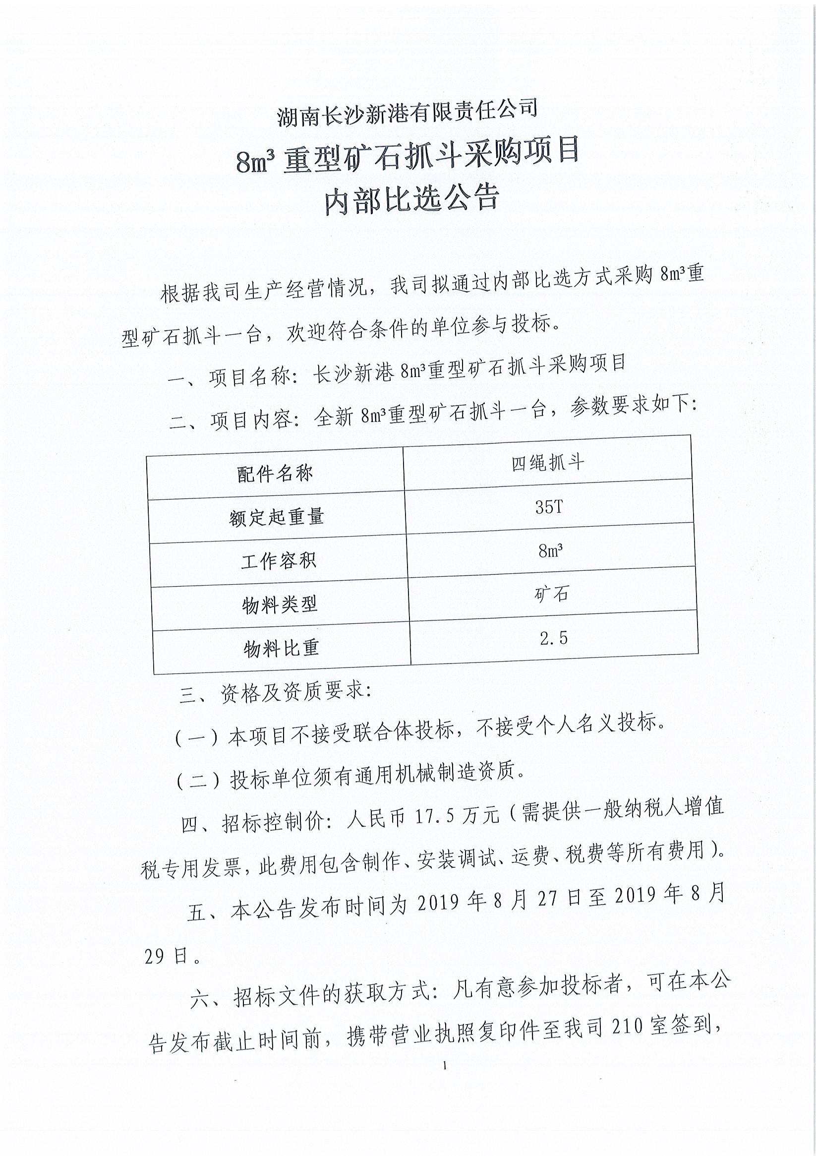湖南長沙新港有限責任公司8m³重型礦石抓斗采購項目內(nèi)部比選公告
