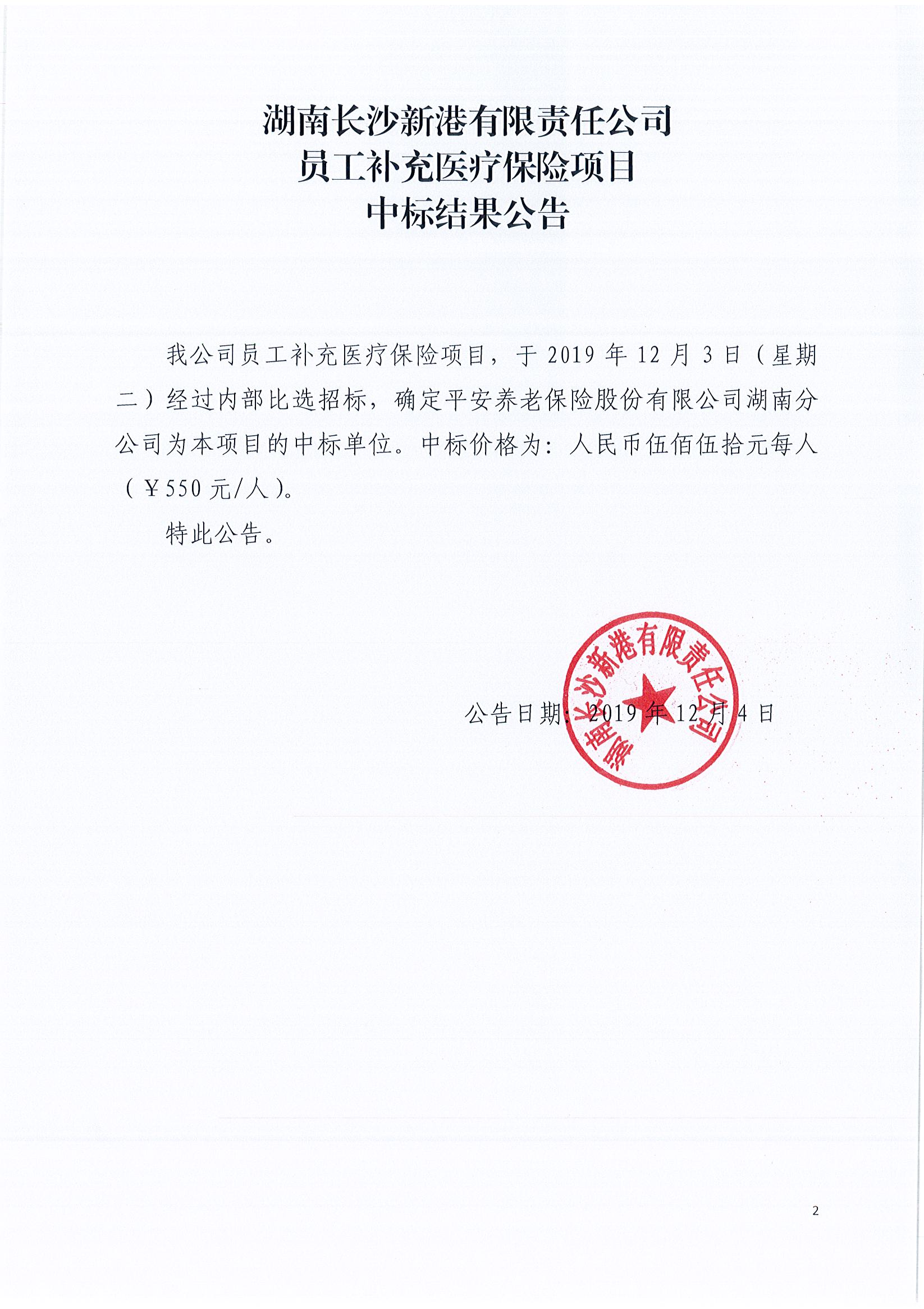 湖南長沙新港有限責(zé)任公司員工補(bǔ)充醫(yī)療保險(xiǎn)項(xiàng)目中標(biāo)結(jié)果公告