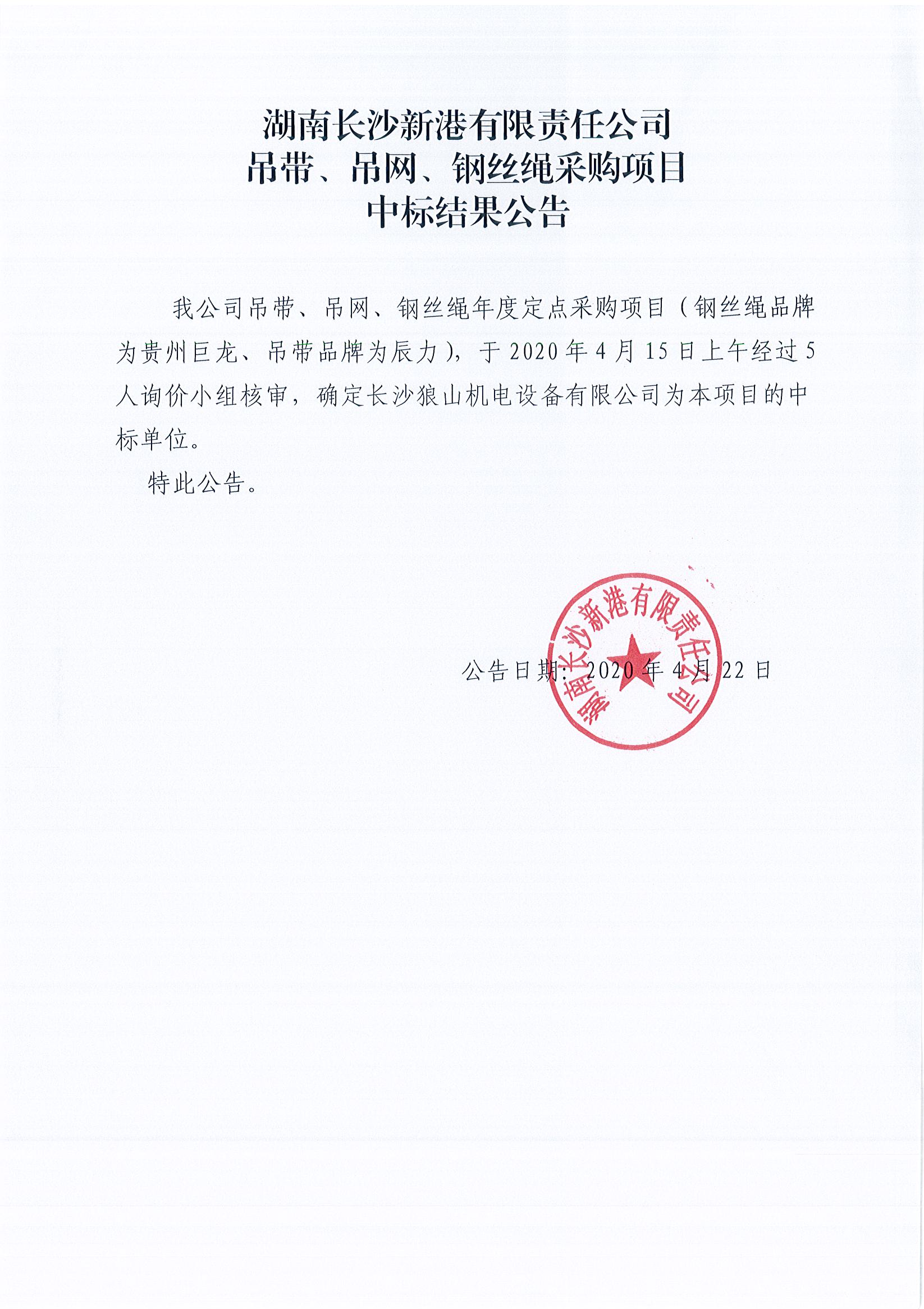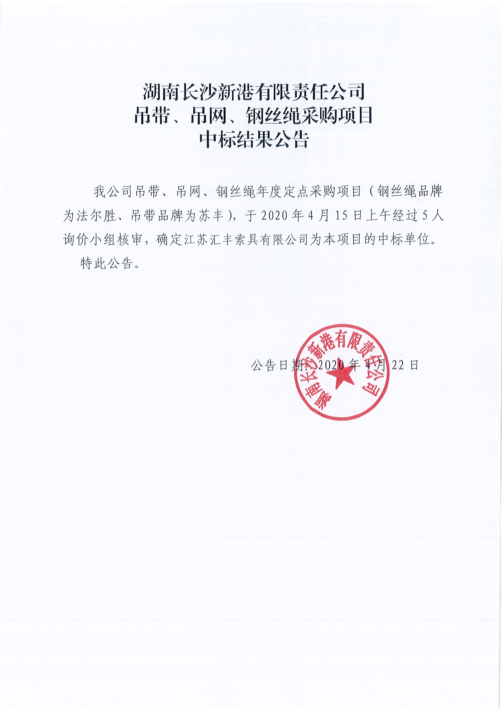 湖南長沙新港有限責(zé)任公司吊帶、吊網(wǎng)、鋼絲繩采購項(xiàng)目中標(biāo)結(jié)果公告