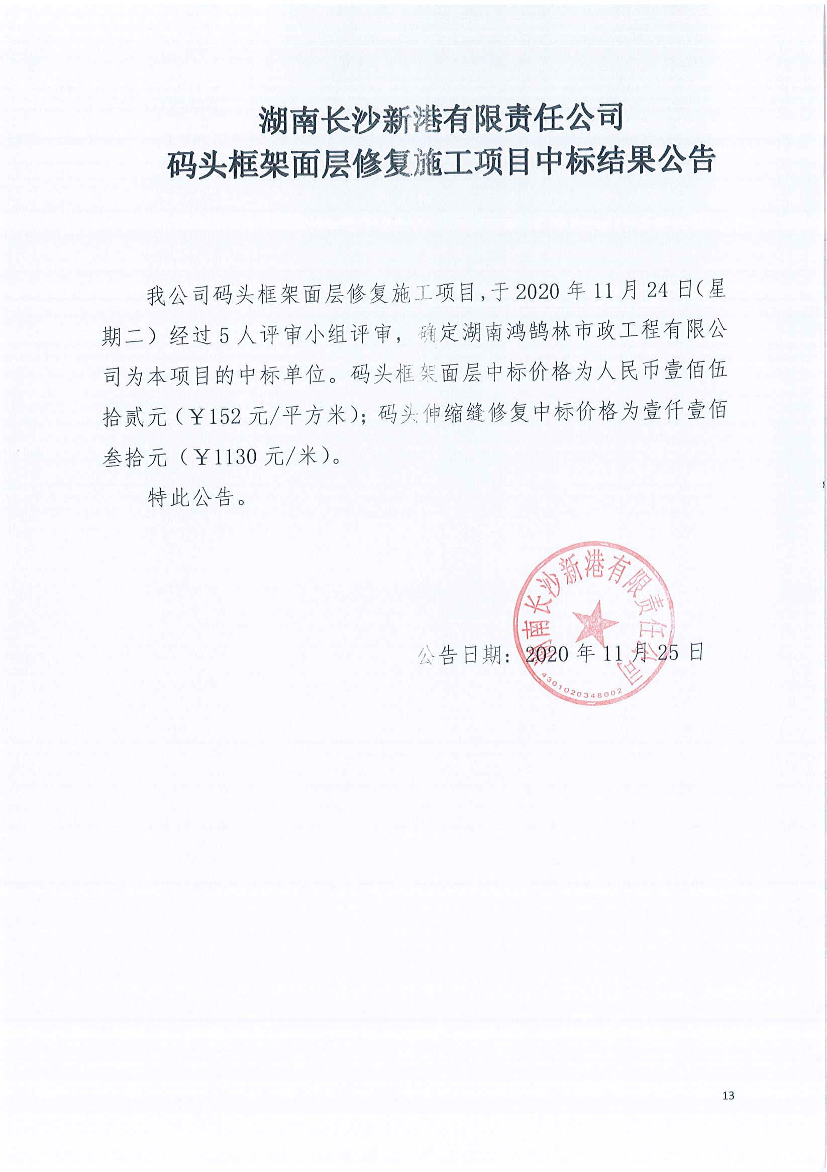 湖南長沙新港有限責(zé)任公司碼頭框架面層修復(fù)施工項目中標(biāo)結(jié)果公告