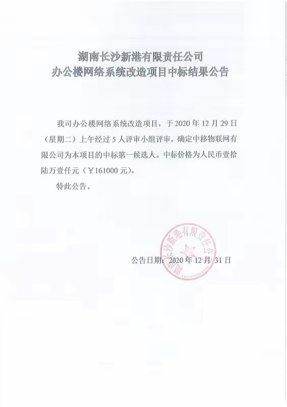湖南長沙新港有限責(zé)任公司辦公樓網(wǎng)絡(luò)系統(tǒng)改造項目中標(biāo)結(jié)果公告