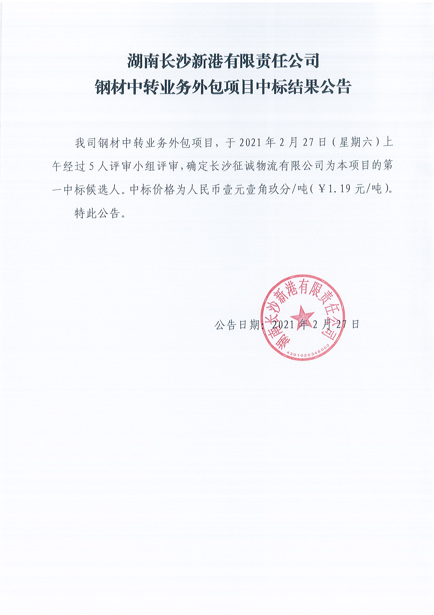 湖南長(zhǎng)沙新港有限責(zé)任公司鋼材中轉(zhuǎn)業(yè)務(wù)外包項(xiàng)目中標(biāo)結(jié)果公告