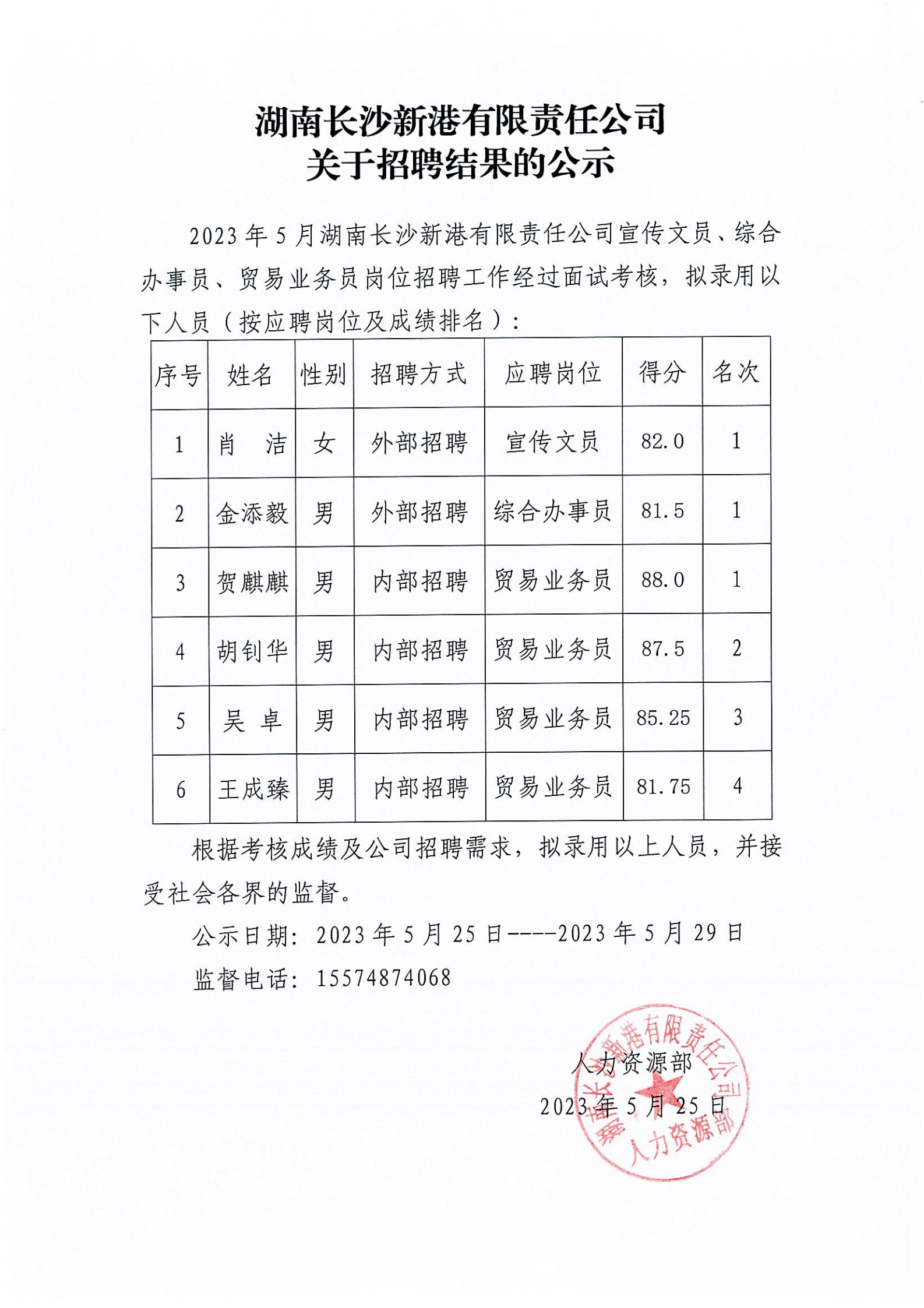 湖南長沙新港有限責(zé)任公司關(guān)于招聘結(jié)果的公示