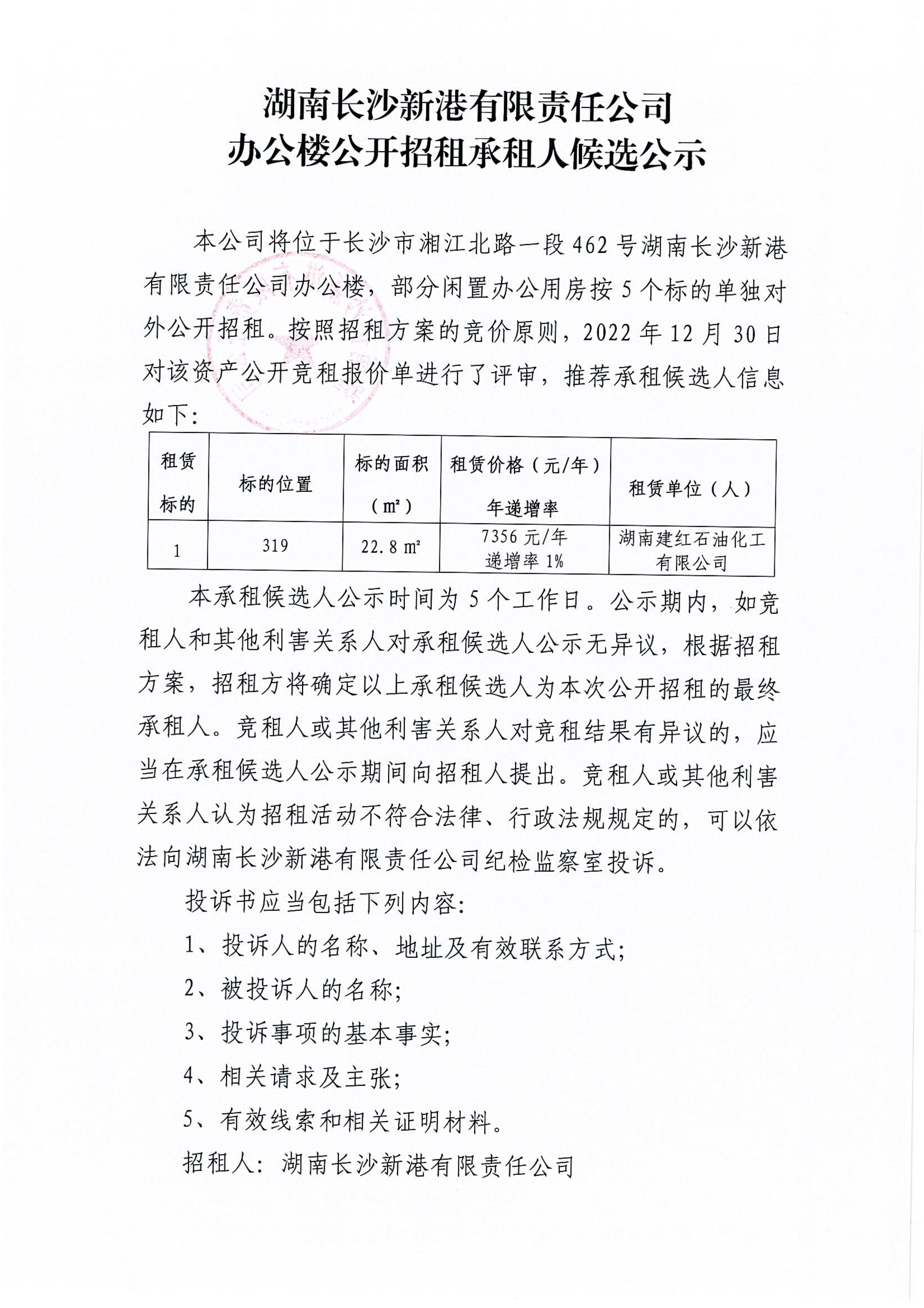 湖南長(zhǎng)沙新港有限責(zé)任公司辦公樓公開招租承租人候選公示