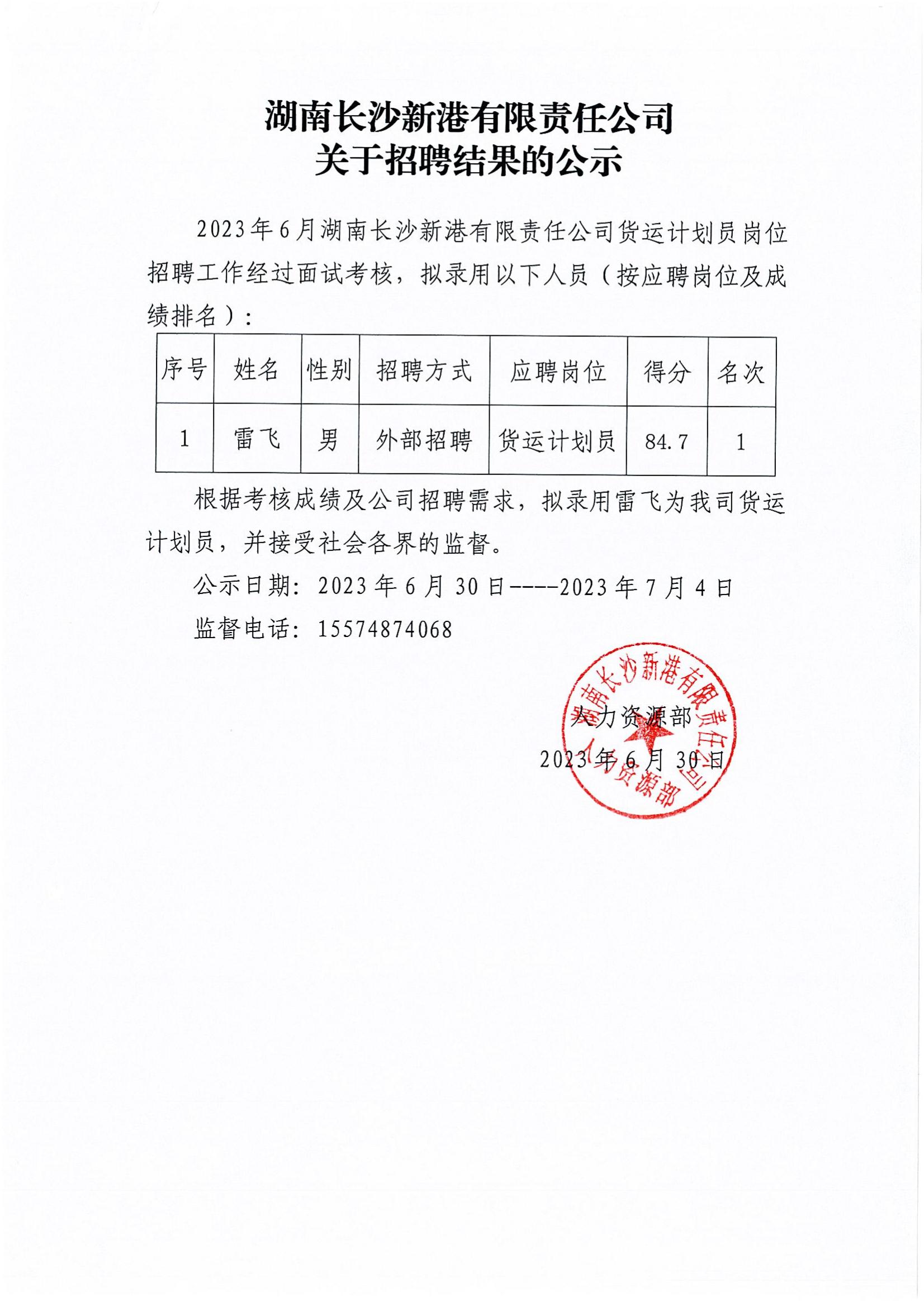 新港公司關(guān)于招聘結(jié)果的公示