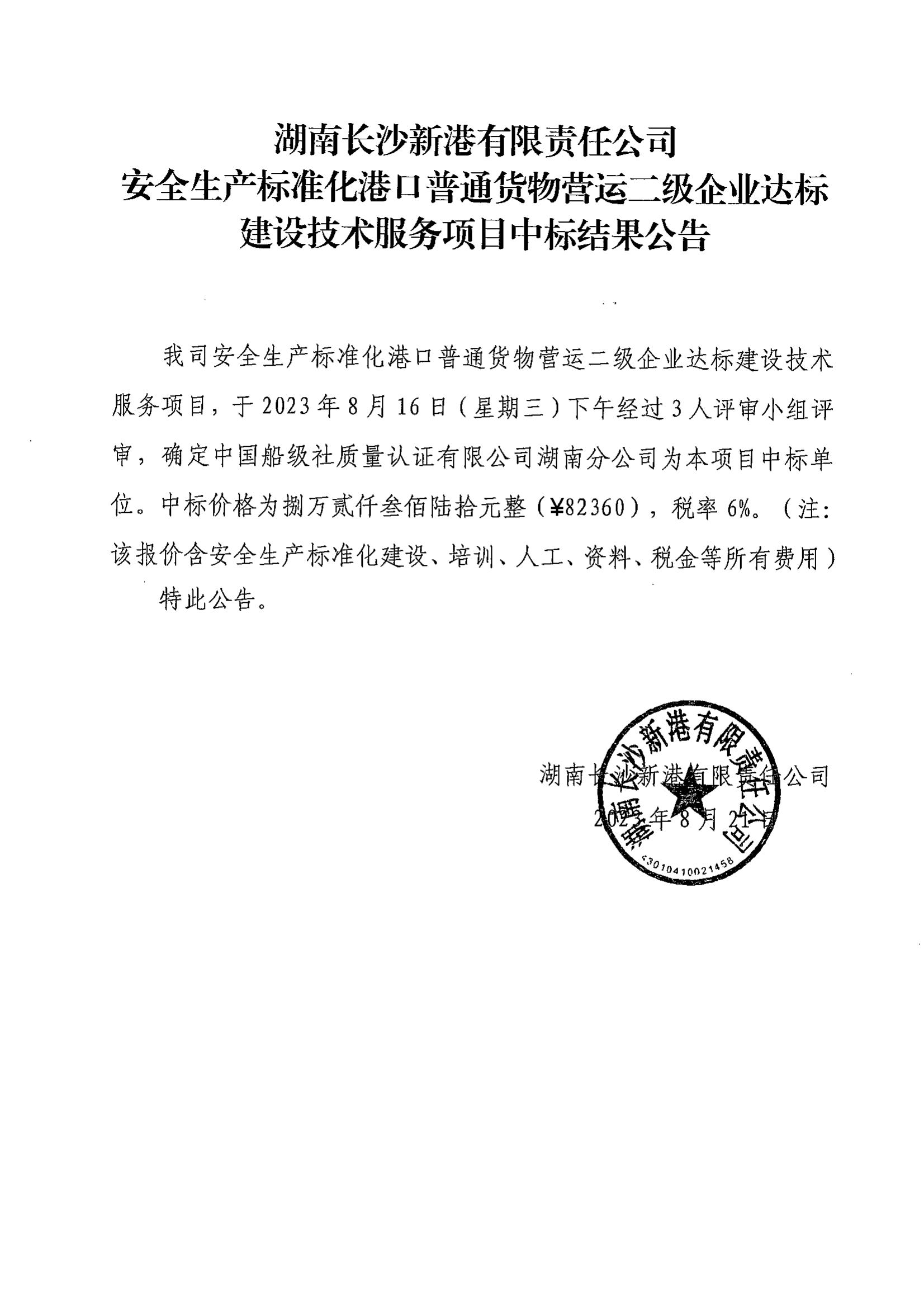 安全生產(chǎn)標(biāo)準(zhǔn)化港口普通貨物營(yíng)運(yùn)二級(jí)企業(yè)達(dá)標(biāo)建設(shè)技術(shù)服務(wù)項(xiàng)目中標(biāo)結(jié)果公告