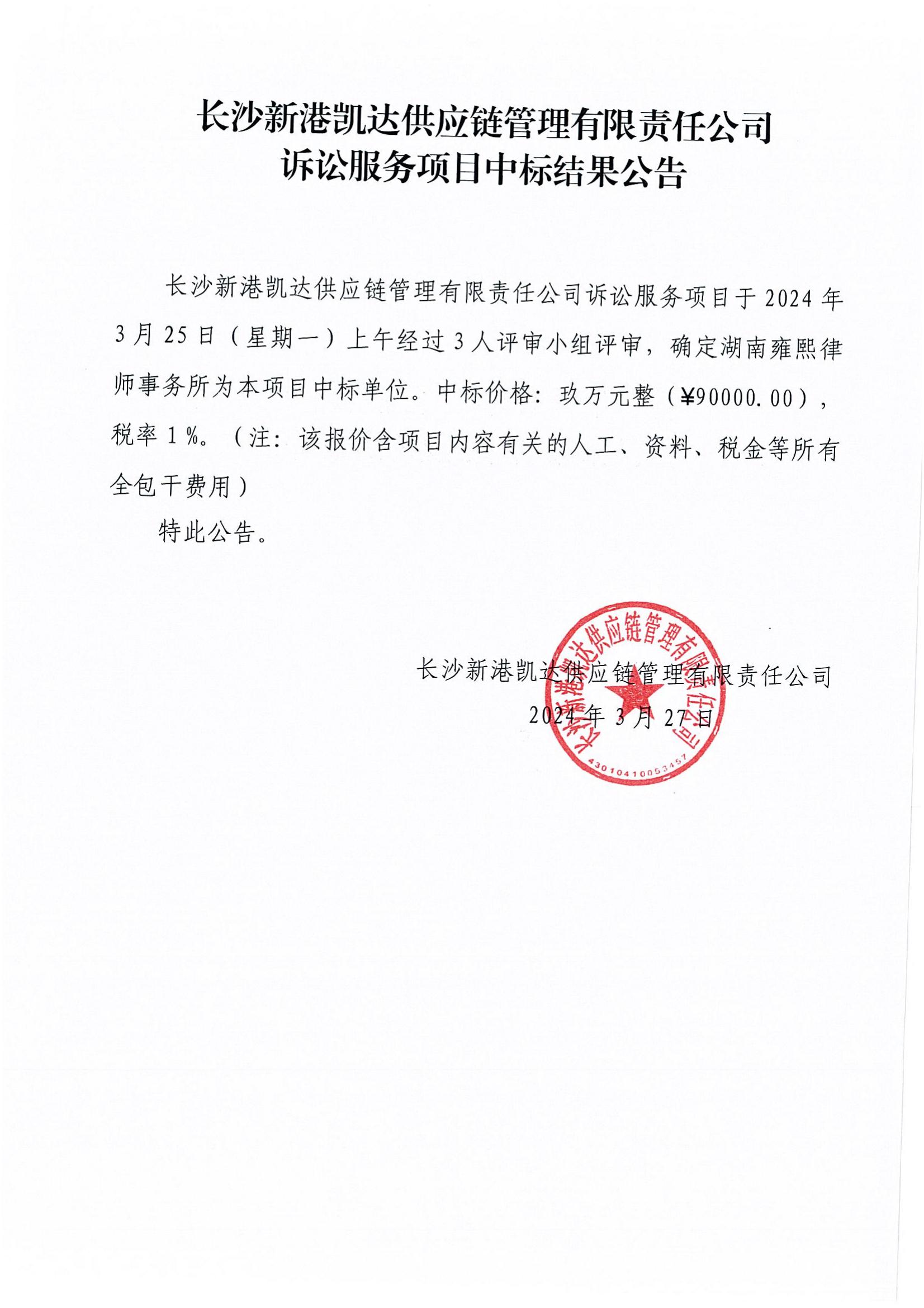 長(zhǎng)沙新港凱達(dá)供應(yīng)鏈訴訟服務(wù)項(xiàng)目中標(biāo)結(jié)果公告