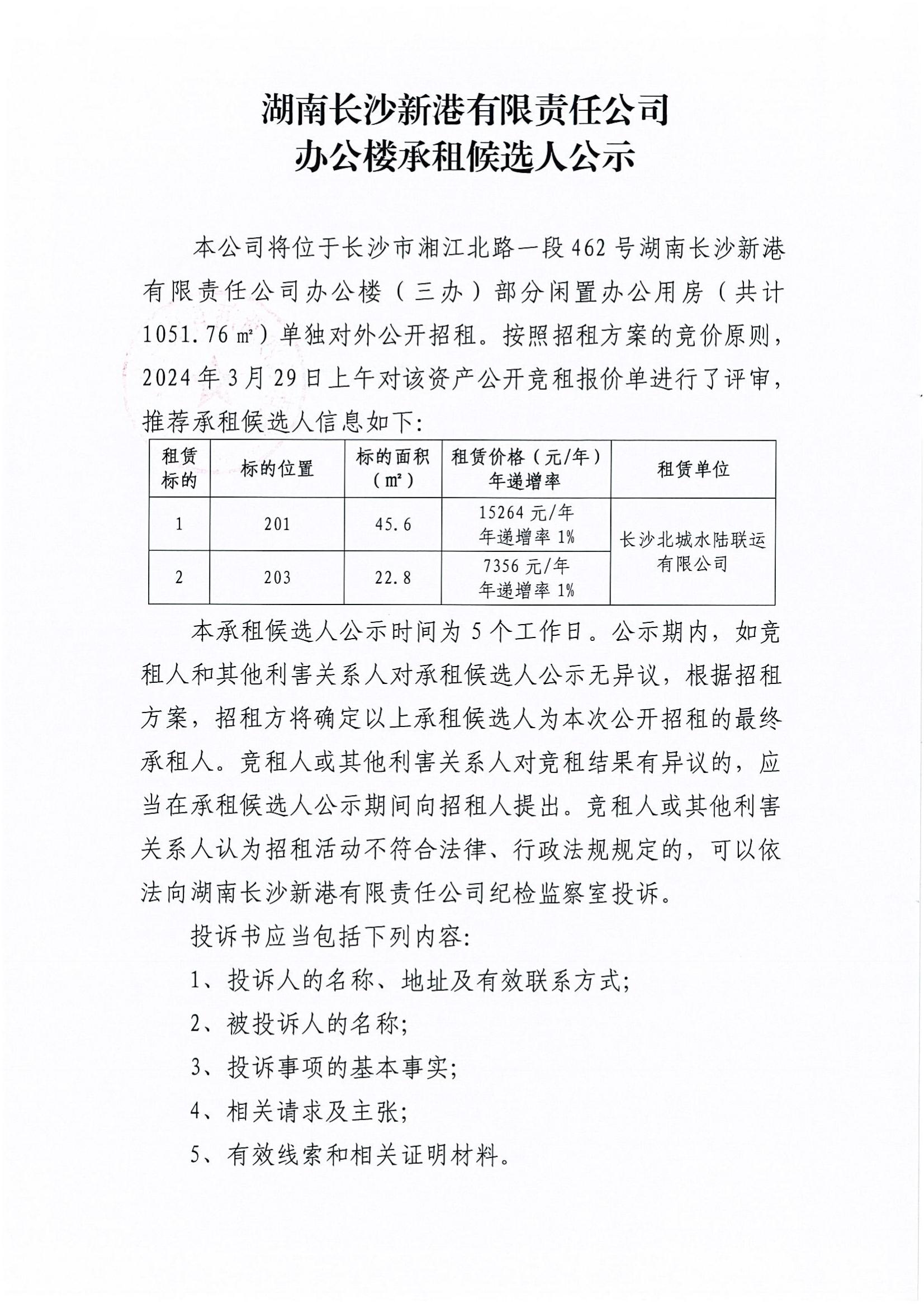 湖南長(zhǎng)沙新港有限責(zé)任公司辦公樓承租候選人公示(201/203)